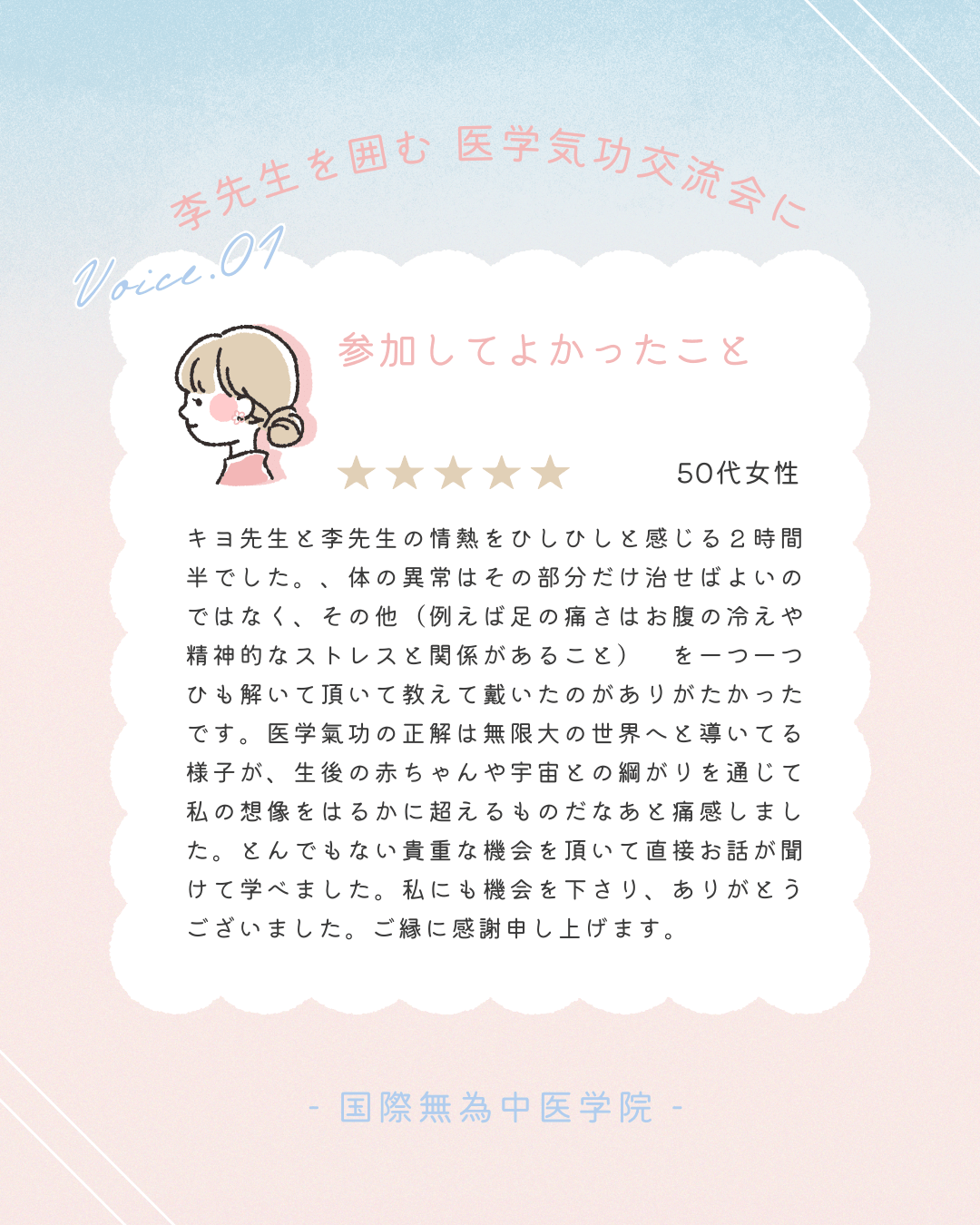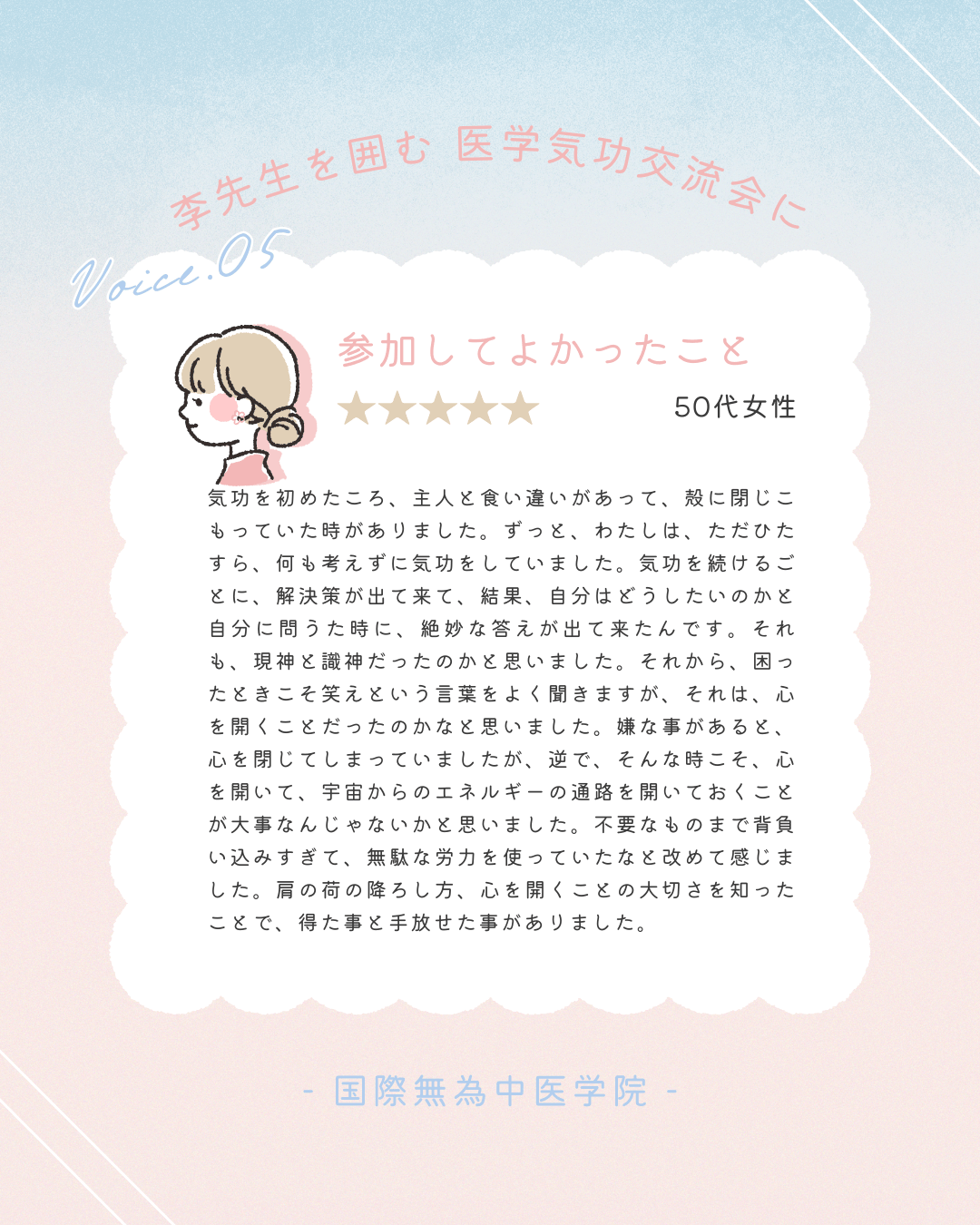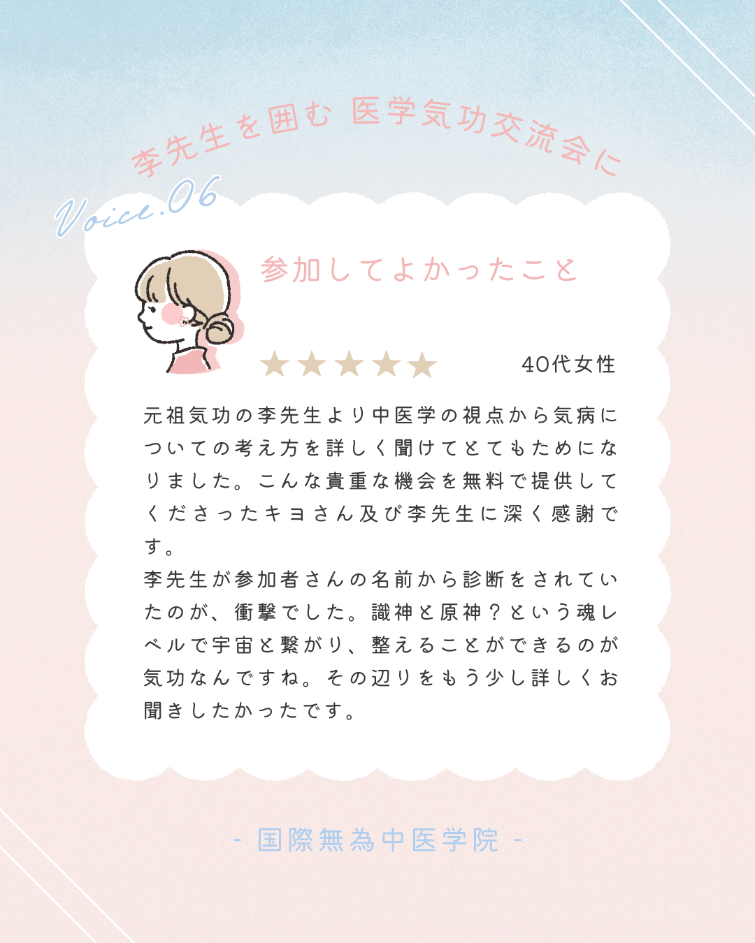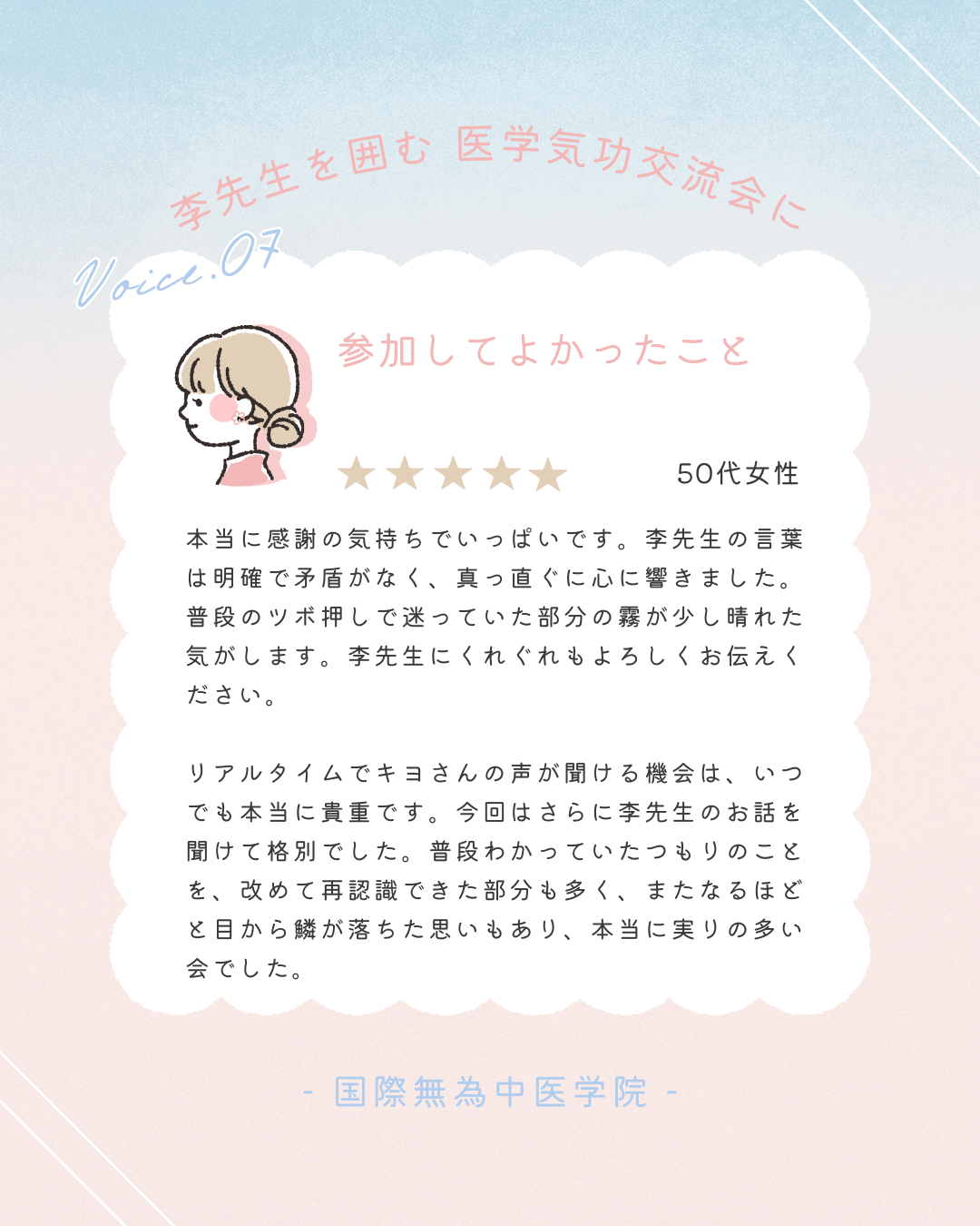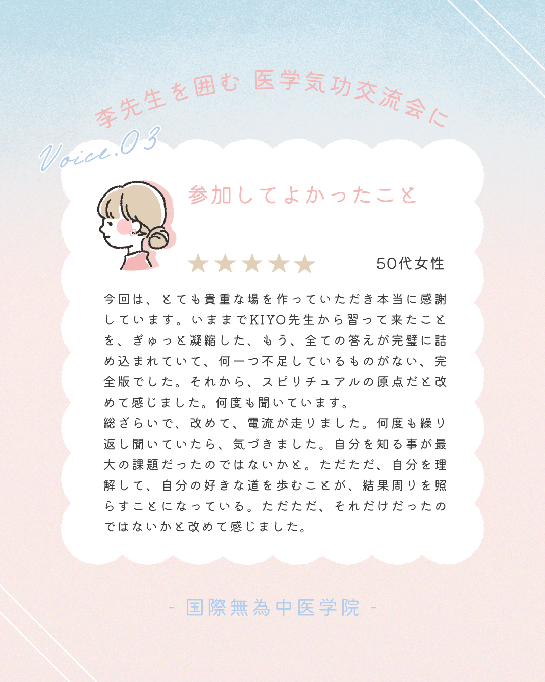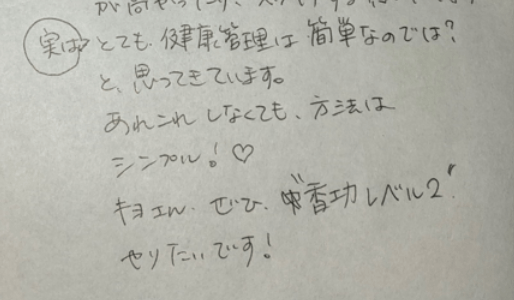 レポートと写真を提出することで、安心して続けられました。最後のシェア会では、自分に馴染みのある症状や、顔、舌、手の写真から、体が伝えてくれる色々な情報について、少し勉強することができてとても興味深かったです。