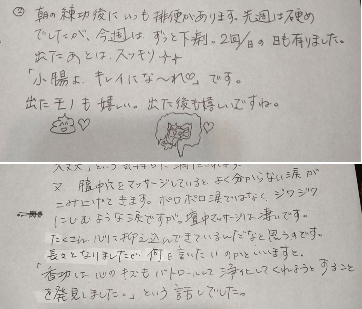 先週は、気功のあとで複数回の通常の排便から始まって、泥状便、水様便と続き、最後には ただ水と不思議な白