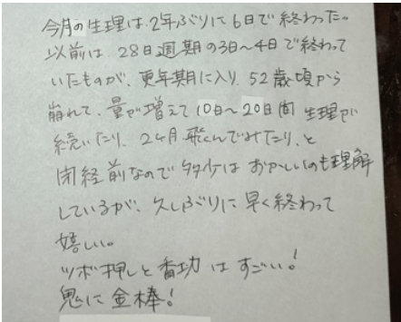 2日目に宿便。3週間目から陽便。舌の周りの歯後のギザギザが無くなった。膀胱が落ちついている。爪が硬くなった。自分の弱い経絡が把握できた。