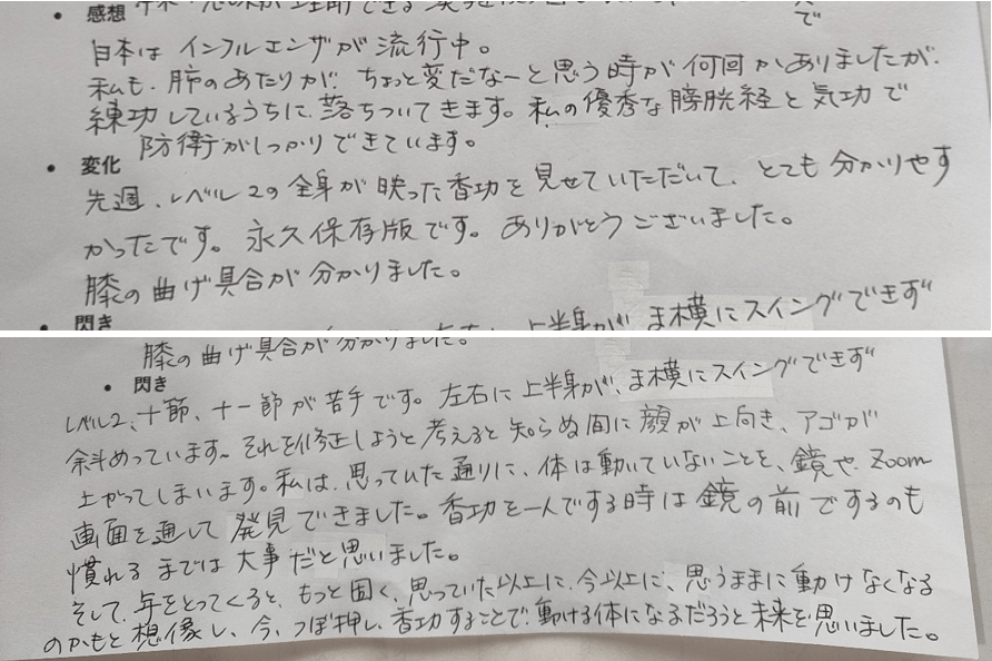 香功基本動作の解説と歴史など詳しい講義で、真似っこレベルから深みが出たと思ってます。実践学でするたびに反応が違い、人それぞれ課題も違う。奥が深くて面白いです。香功が習える場所は少ないですし、出会えてよかったです✨